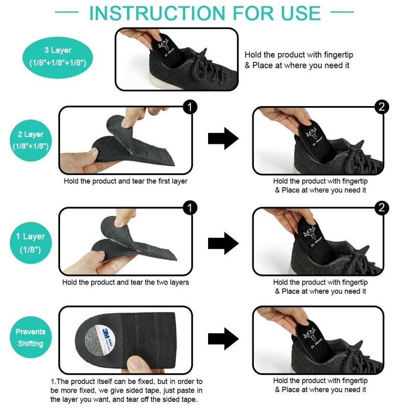 - Three Layer are Glued Together: The insole is rubber with a very adhesive layer between the layers, when you adjust the lift height the next layer do not tore away, will not leave any uneven surface.1/8" thick per layer, increase your height by 3/8 inch without anyone noticing. According to the difference in leg length, allow you to build up height by adding layers yourself, the inserts to even up your leg length difference. Persist in long-term use to improve walking posture and gait.