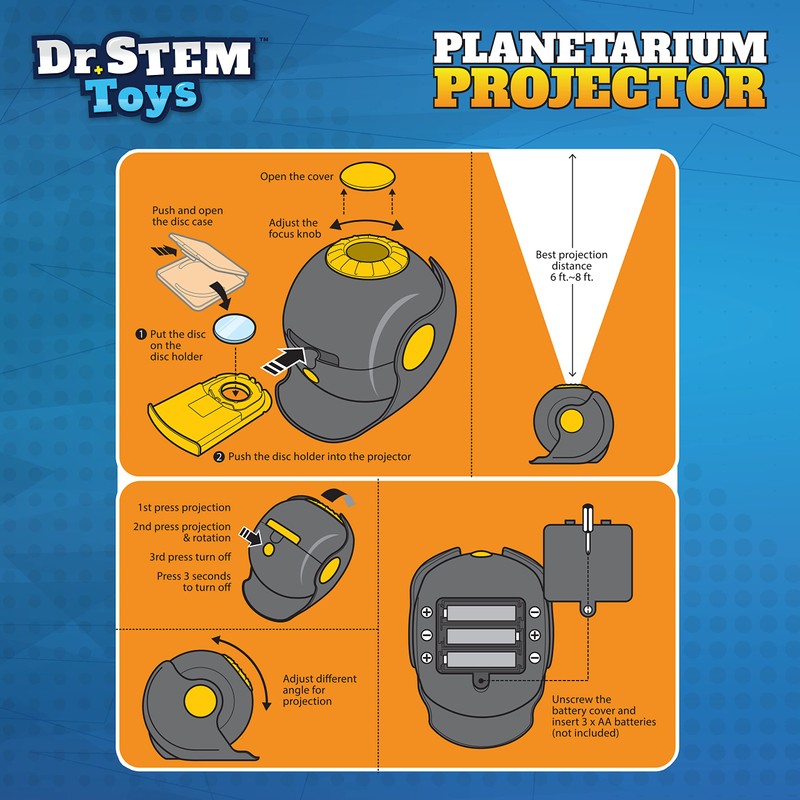 • Easy to Use: Simply insert 3 AA batteries (not included) into your night sky projector. Then slide in a disc, adjust the focus & angle, and press the button to project images for up to 30 minutes.