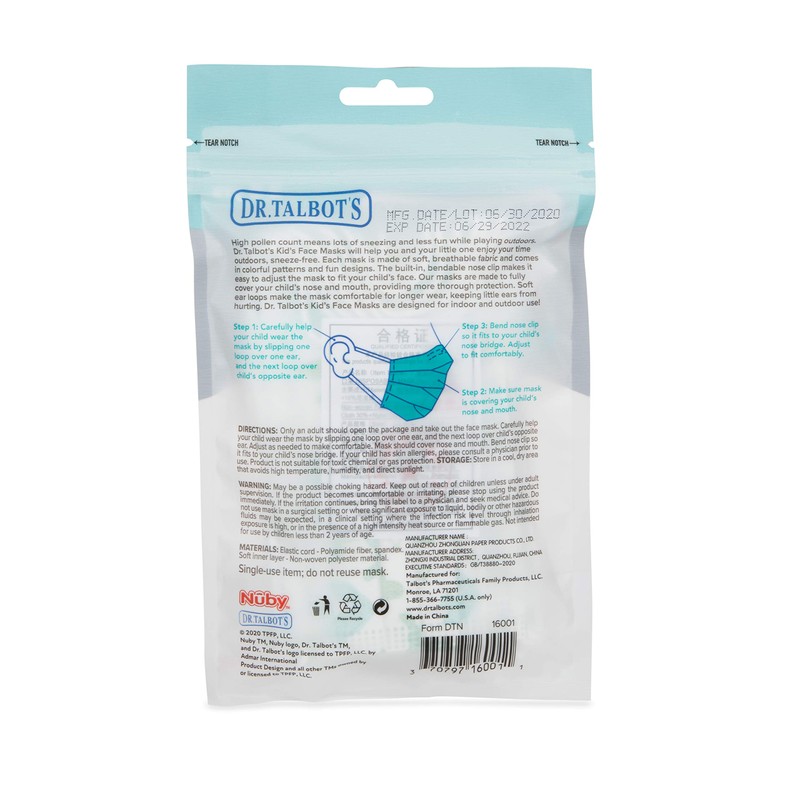 Dr. Talbot's Kid's Face Masks will help your little one enjoy sneeze-free time indoors and outdoors. Our three-layer design helps protect your little one from sneezing and irritation caused by pollen, dust, and dirt without compromising breathability and comfort. Each face mask is made of soft, breathable material with a built-in, bendable nose clip that easily adjusts to fit your child's face, providing more thorough protection, and soft ear loops for longer, more comfortable wear, keeping little ears from hurting. This -pack of face masks is intended for children ages C years old and includes varied, colorful patterns and fun designs. Your little one will love them! Please note: Per international regulations, Dr. Talbot's is required to include an expiration date on the packaging, though this does not reflect the efficacy of the masks, as they do not expire.