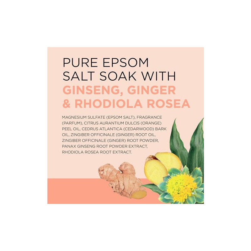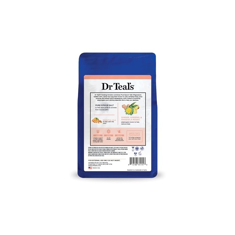 Dr Teal’s Stress Relief Pure Epsom Salt with Ginseng & Ginger Essential Oils is a relaxing soaking solution that helps ease soreness while refreshing your skin. Ginger, ginseng, and rhodiola rosea help reduce stress and calm the mind. When paired with muscle soothing Pure Epsom Salt (Magnesium Sulfate), it’s the perfect combination for physical and mental relief. Pair it with your favorite Dr Teal’s body wash to create an exfoliant that will leave your skin feeling rejuvenated. Dr Teal’s products are vegan and cruelty-free and contain no harsh ingredients such as parabens and phthalates.