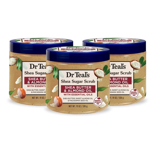 Dr Teal's Shea Sugar Body Scrub, Shea Butter with Almond Oil & Essential Oils, 19 oz (Pack of 3) (Packaging May Vary)