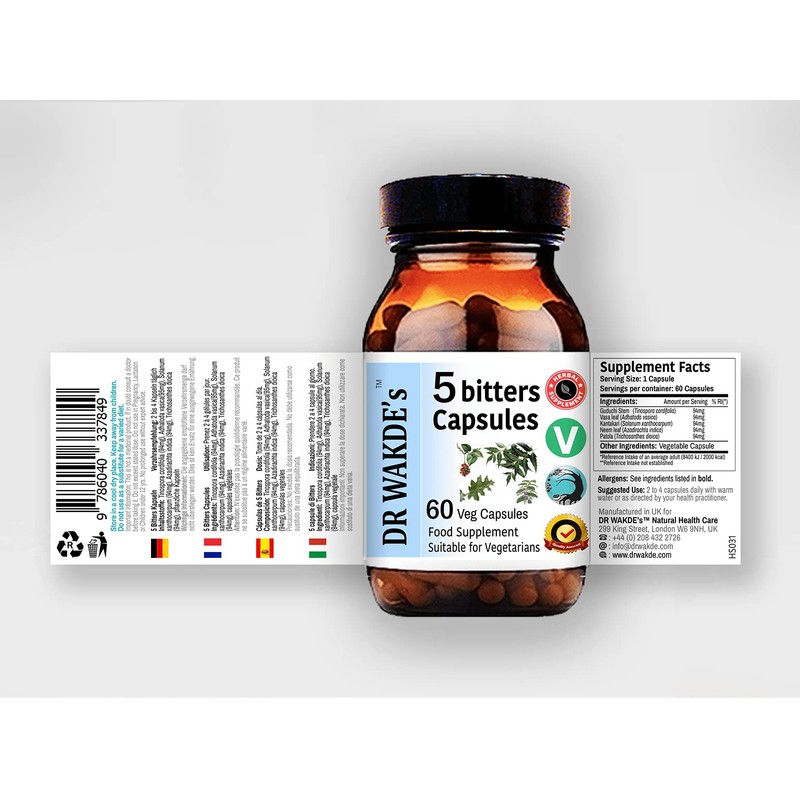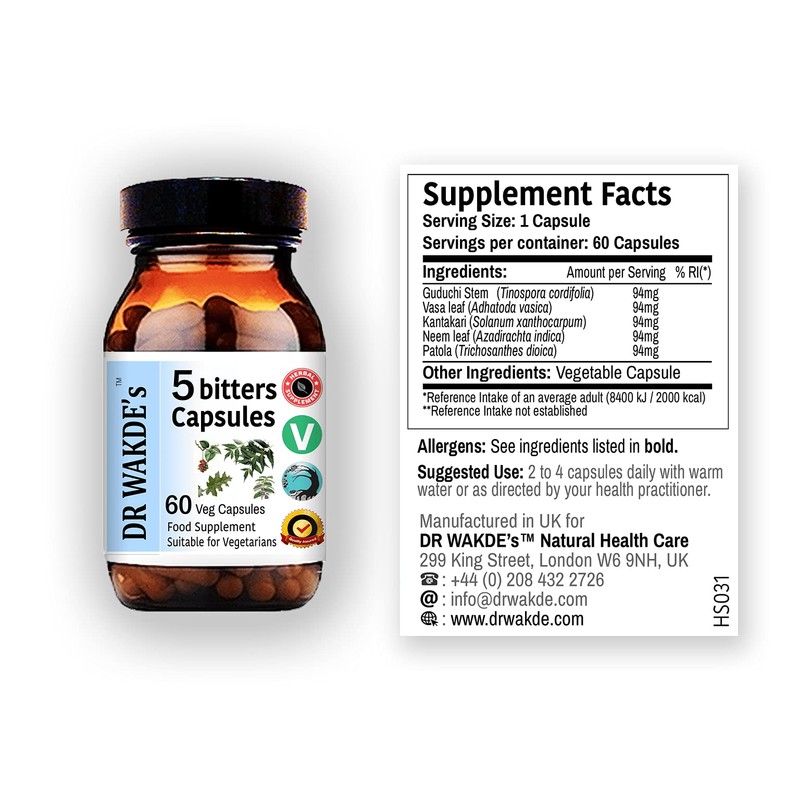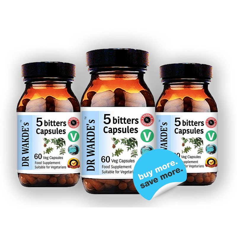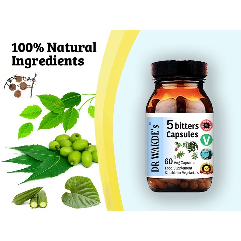 - ✔ DR WAKDE'S FIVE BITTERS CAPSULES: 5 Bitters Capsules is the synergistic blend of five ayurvedic herbs. i.e. Guduchi Stem, Vasa leaf, Kantakari, Neem leaf, Patola. They are extremely bitter in taste and widely used in Ayurveda for deep detoxification. People have been using them for many years for their health benefits. DR WAKDE’S 5 Bitters Capsules Capsules contain a pure blend of all these herbs.