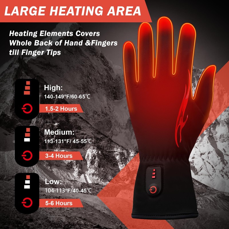 - 【Widely Heating Warm Gloves】Rechargeable glove liners rapidly heat up within 30 seconds. The safe and durable carbon fiber heating elements cover the whole back of the hand and fingers to the fingertips, keeping your hands warm and cozy. They protect your hands from extreme cold and frostbite.