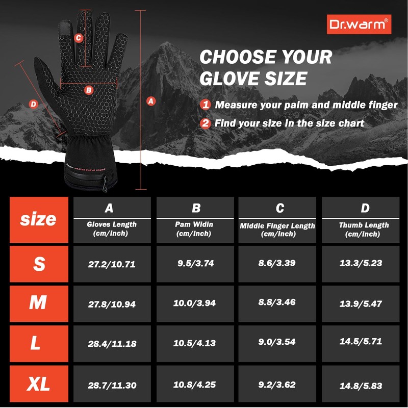 - 【2024 Upgraded Thin Glove Liners 】Dr.warm Thin heated gloves with a new design perfectly fit your hands, are made of double-layer polyester material, and feature a form-fitting flexible design so the heating elements press up against the hand and fingers. You can layer up with skiing, cycling, and other heavier gloves in harsher conditions. You also can wear them on your own as regular gloves. keeps your hand warm in tough winter and snow season.