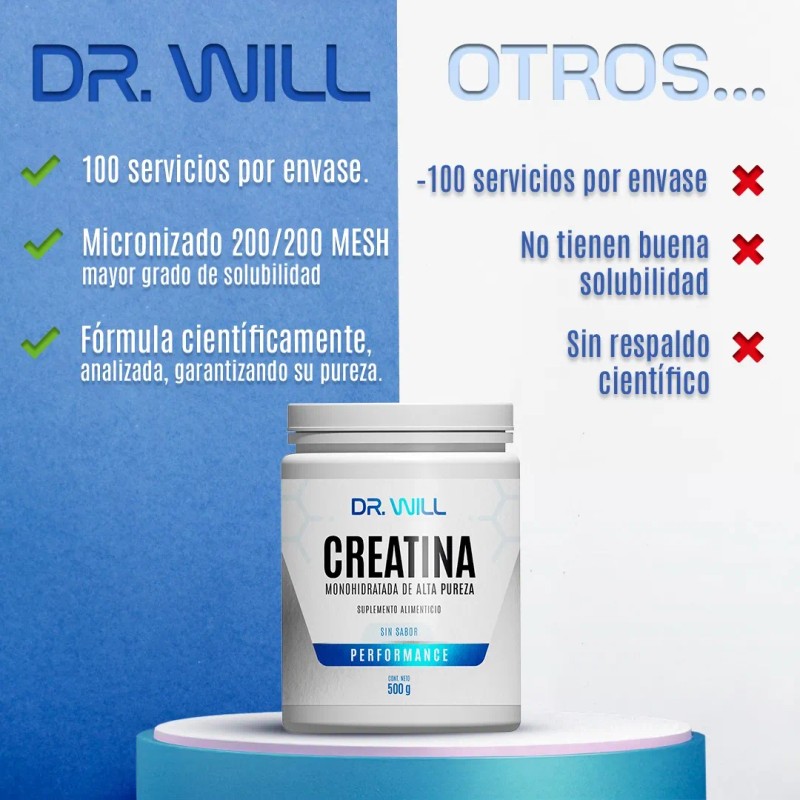 Dr Will Creatina Monohidratada Pura es un suplemento en polvo micronizado, ideal para complementar tu rutina de entrenamiento y actividad física.