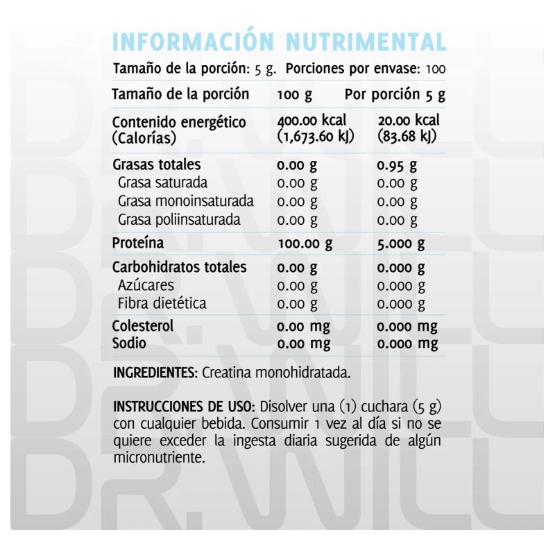 Dr Will Creatina Monohidratada 500g 💪 100 servicios para fuerza, energía y recuperación rápida en tus entrenamientos ⚡🏋️♂️