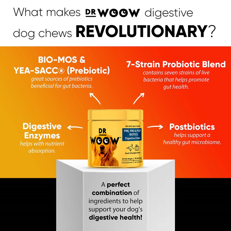 Dr Woow Probiotics for Dogs, Pet Dog Probiotics and Digestive Enzymes, Duck & Pumpkin Flavor Dog Probiotic Supplements, Dog Vitamins Dog Probiotic Chews and Prebiotics for Dogs, Dog Gas Relief