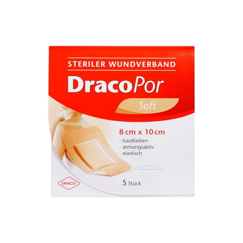 Sterile wound dressing for the first aid of non-infected wounds. DracoPor soft skin-coloured is a sterile wound dressing for acute wounds, as well as for the care of sharp and cut wounds.