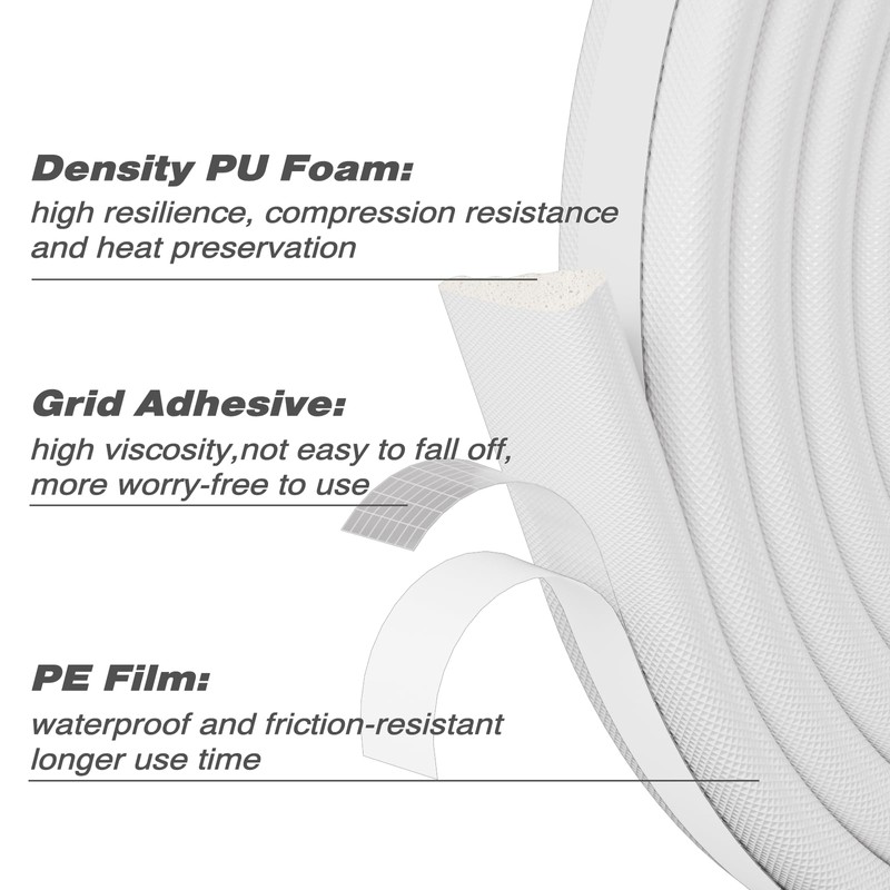 • HIGH-QUALITY WINDOW DRAFT EXCLUDER:Door draft excluder strip uses fine and highly elastic PU foam inside, which does not deform under any extrusion, achieving a good sealing effect; the outside uses a smooth and wear-resistant PE film to effectively prevent collisions and reduce wear on doors and windows; the bottom uses an integrated grid adhesive, which is not easy to fall off during use
