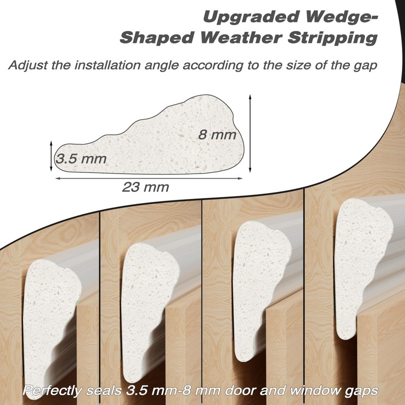 • UPGRADED WEDGE-SHAPED DESIGN:The draught excluder for doors adopts a wavy wedge-shaped design, which can adjust the installation angle according to needs and fit the gaps of different sizes more perfectly. Window draft seal has a minimum thickness of 3.5 mm and a maximum thickness of 8 mm, and is best suited for gaps of 3.5 mm to 8 mm