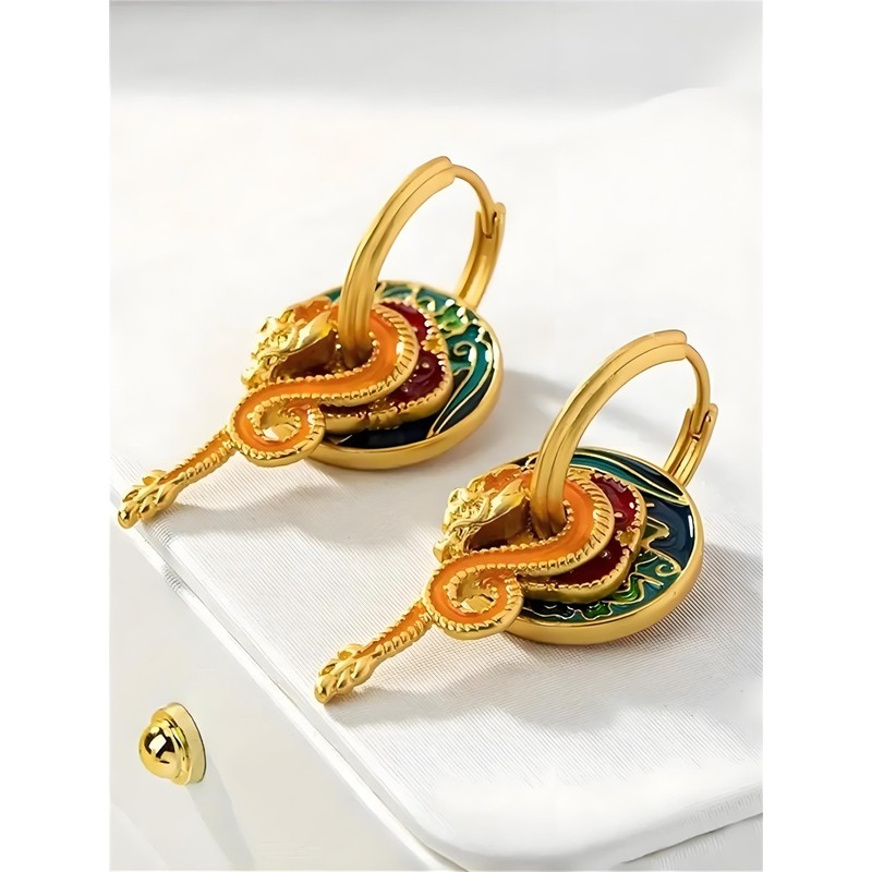 - [Bold Dragon Earrings Design]:These Dragon Earrings for Women showcase a striking gold-tone dragon coiled around a circular hoop, enhanced with red and green colorful enamel for a powerful, symbolic look. Inspired by Chinese mythology and art, the design blends tradition with modern edge, making these dangle earrings the perfect accessory for women seeking expressive statement jewelry with cultural depth