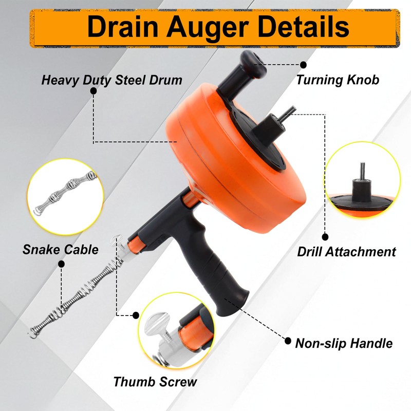 - 【Complete Kit Included】Package contains: 1×50FT drain auger, 1×pair work gloves, 1×instruction manual.