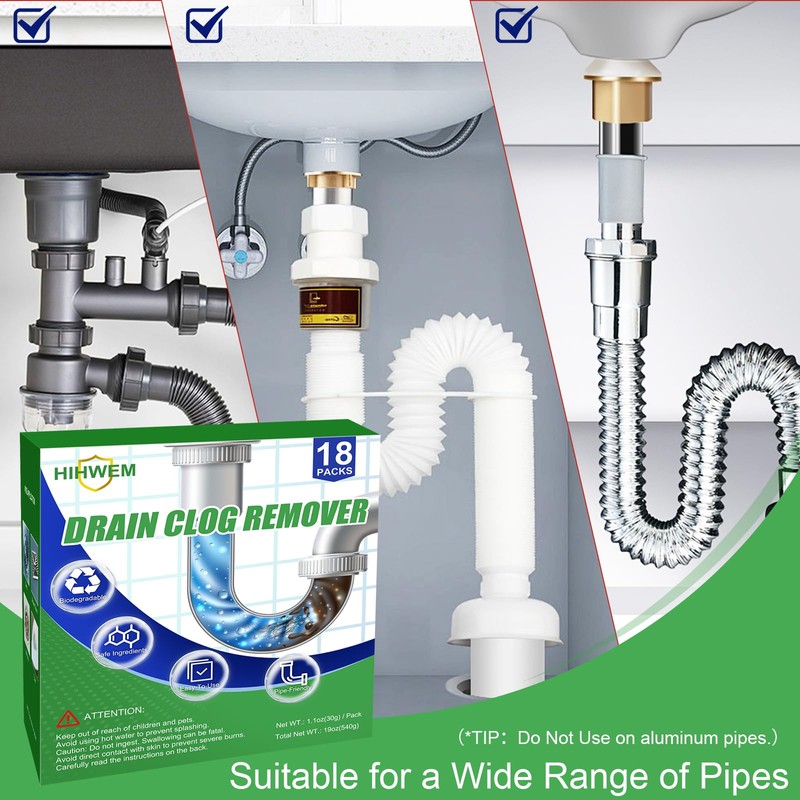- Widely applicable, material safety:HIHWEM Drain Clog Remover is suitable for various types of pipelines such as plastic pipes, iron pipes, stainless steel pipes, etc. The mild and environmentally friendly formula effectively protects the pipeline material, has no strong corrosiveness, and is safer and more environmentally friendly to clean (do not use on aluminum pipes).