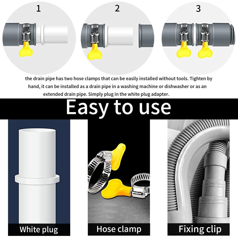 - Easy and quick installation: universal drain hose can be easily installed without tools. If you need to extend the hose, simply connect the adapter, add hose clamps can be used to fix both ends without removing the previously connected drain pipe.