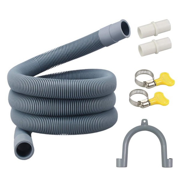 - Use of the packaging: the drain hose set contains a 1.5 m long hose, 2 white extension adapters, 2 stainless steel clips and 1 U-shaped drain pipe holder for flexible washing machines, which is also suitable for most front washing machines.