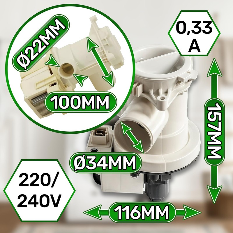 - Size – The washing machine drain pump is 157 mm long, 116 mm wide and 100 mm high. Inlet diameter 34 mm and outlet diameter 22 mm