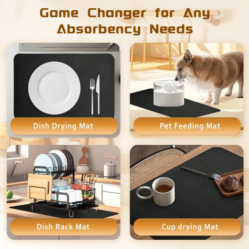 Draining Mat, Kitchen Super Absorbent Draining Mat, Super Absorbent Kitchen Counter Mat, Coffee Machine Mat, Quick Dry Dish Drainer Mat, Anti Slip Drainer Mat for Kitchen Counter (Black, 16"X24")