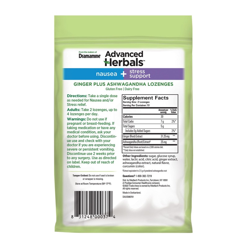From the makers of Dramamine, Advanced Herbals, Nausea + Stress Support Lozenges provide nausea relief with the added benefit of helping to reduce stress. These stress relief lozenges contain ashwagandha, an herbal supplement, that supports stress relief. Designed to support stress relief and create calm with this stress relief supplement that will not only help settle your stomach but also your nerves. These anti-nausea lozenges contain a clinically-tested ginger dose** that supports nausea relief caused by stress, motion sickness, or upset stomach. Keep these great tasting tropical fruit and ginger flavored lozenges in your work bag, backpack, purse, or car to combat nausea and stress anywhere you go. Contains 1 pack of Advanced Herbals, Nausea Relief and Stress Relief with Ginger and Ashwagandha, Tropical Fruit and Ginger Flavors, 20 Ct. **extract equivalent to clinically tested dose of powdered ginger for motion