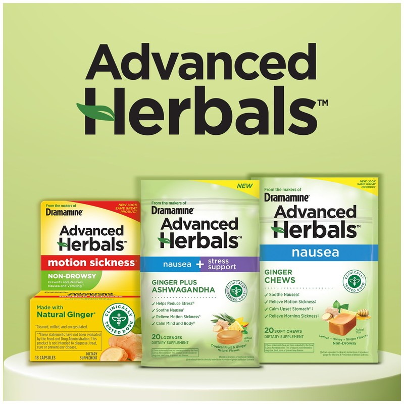 From the Makers of Dramamine, Advanced Herbals, Nausea and Stress Support with Ginger and Ashwagandha, Tropical Fruit and Ginger Flavored Lozenges, 20 Ct