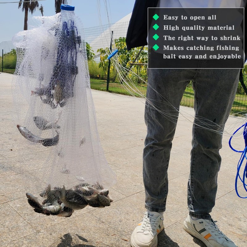- Material: Handmade. 0.3mm thickness copolymer monofilament mesh , with better durability. with natural fit. High quality craftsmanship makes this product a must for fishermen. Whether you are a beginner or cast net master, this net is very easy to open and makes catching your own live bait easy and fun.
