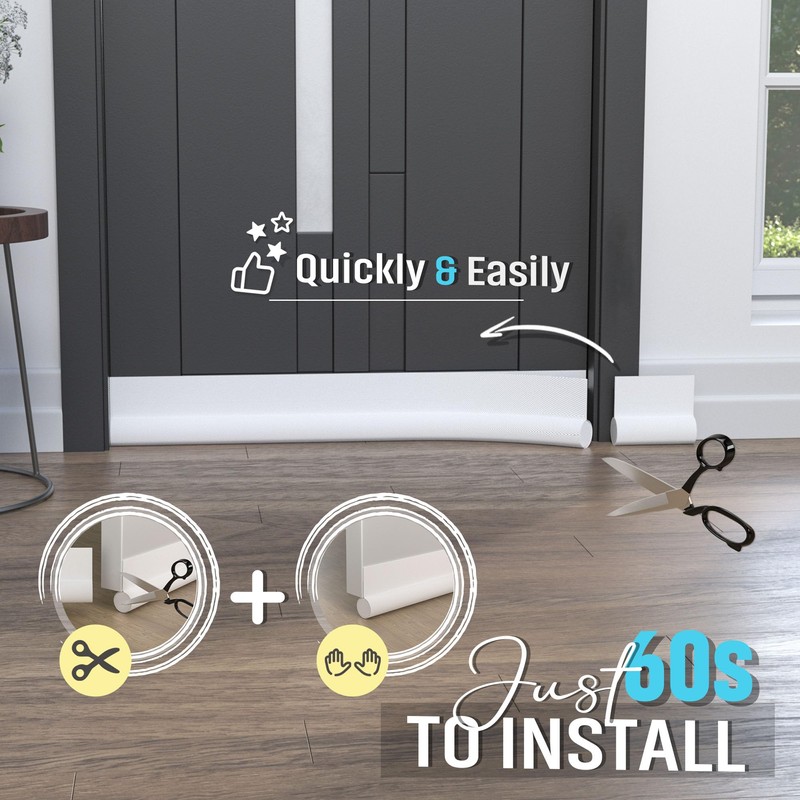 - ⏱【QUICKLY INSTALL WITHIN 1min】Only takes three steps to install our draft excluder:1、Measure the length of your door & clean the door surface;2、Cut off the excess door stoppers andpeel the adhesive layer off;3、Stick the velcro on the door & stick our door draught excluder. Then you have down!(Warm Tips: Preheating the glue with a hair dryer can make the adhesive stronger.)