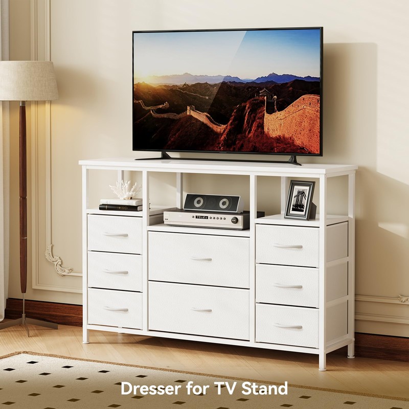 DRAWERHOM 8-Drawer Fabric Dresser TV Stand for 40" TV - Sturdy Steel Frame & Wood Top Chest of Drawers, Lightweight Storage Organizer for Bedroom, Closet, Entryway (43.31" Wide, White)