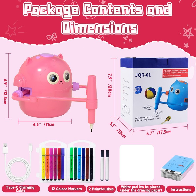 - 【Whate You Get】 Featuring 100 unique drawing cards, the drawing robot for kids provides endless opportunities for kids to express their creativity and enhance their artistic skills. You will receive a drawing robot and 100 drawing cards with different patterns, 16 colorful markers, as well as 1 charging cable and an instruction manual