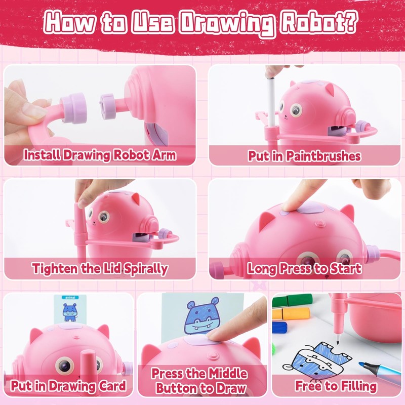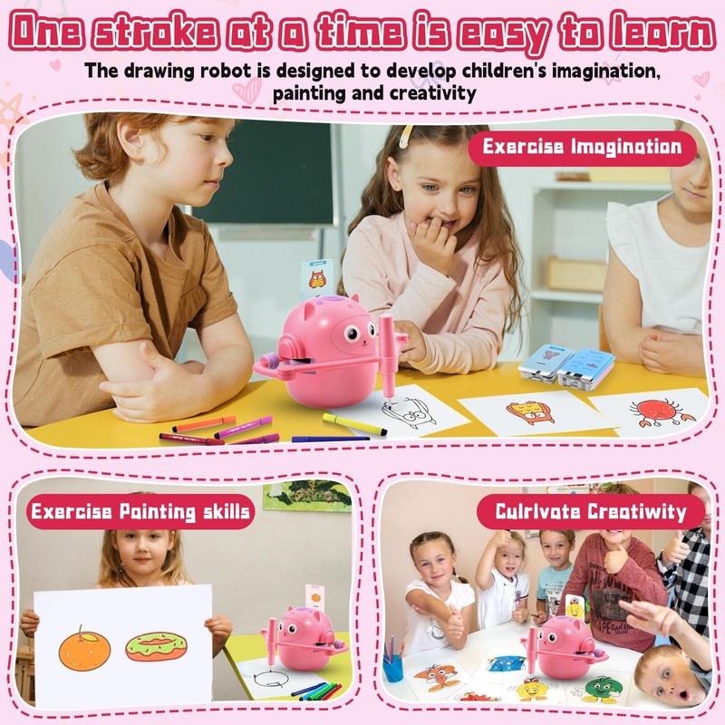 - 【Easy to Operate】: Just insert the drawing card and put the pen in place, and the i draw robot will start painting according to the steps. The child first observes the robot's painting, then imitates it and presses the button to learn the next step. After that, the child can color the painting by himself
