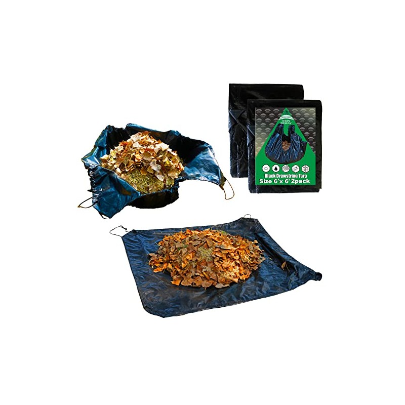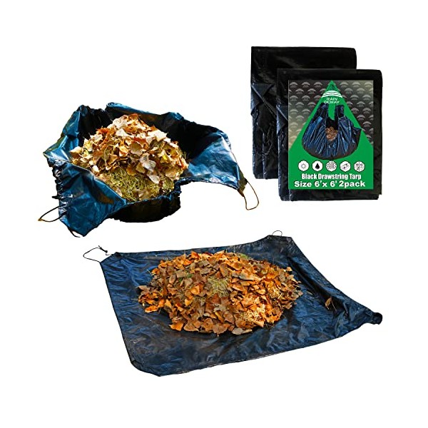Drawstring Tarp 6x6 Feet (2pack) , 9 mil Black Poly Yard Tarp with Drawstring, Reusable Leaf Lawn Garden Tarp Bag by RAINDEWAY