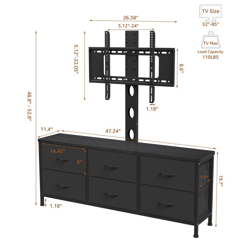 DrawXynth TV Stand with Mount, Fabric Dresser with 6 Drawers for 32/45/55/60/65/75/85 inch TVs, Black Dresser Entertainment Center, Modern Media TV Console Table