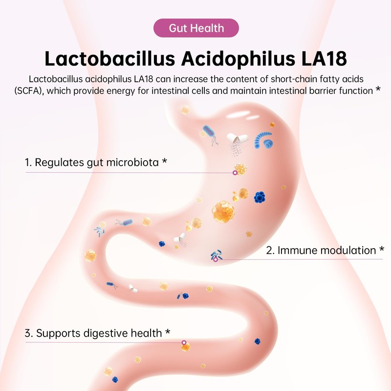 - Gut Health: Lactobacillus acidophilus LA18 and Bifidobacterium animalis subsp. lactis WKB148 regulate the gut and promote healthy bowel movements to support digestive function and increase absorption of essential nutrients