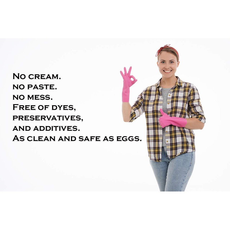 • No cream, no paste, no mess. Free of dyes, preservatives, and additives. As clean and safe as eggs.