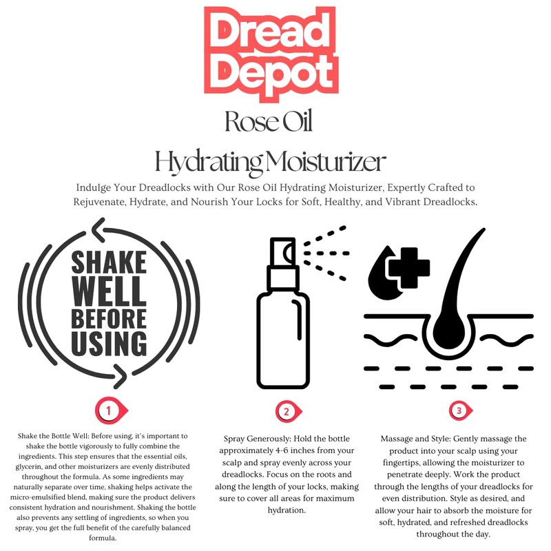 - Deep Hydration: Infused with nourishing rose water, glycerin, and organic oils to deeply hydrate and revitalize dreadlocks.