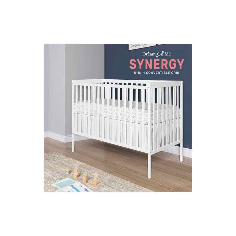 Dream On Me Dream On Me Synergy 5-In-1 Convertible Crib In White, made of New Zealand Pine wood, JPMA & Greenguard Gold Certified, features 3 mattress height settings