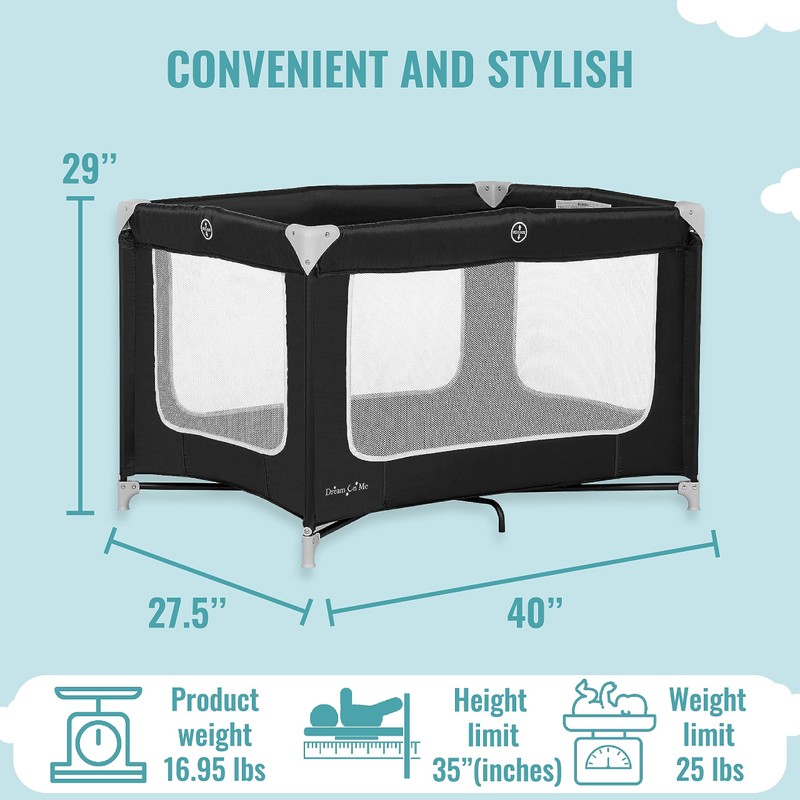 - PRODUCT SPECS.: Dimensions: 40” L x 27” W x 29” H (inches) with a weight of 16.95 lbs. The playard is meant for children up to 35” inches tall.