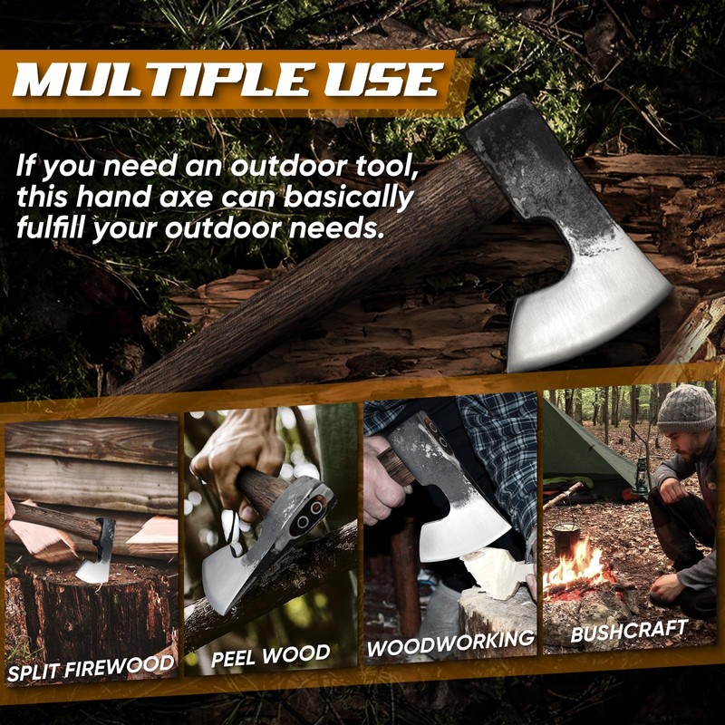 - Camping Axe with Special SheathThe wood axe for cutting wood comes with a unique leather sheath that ensures that the holster does not easily fall off when carried, but protects the camp axe blade. It's convenient for you to carry the bushcraft hatchet around with you and enjoy outdoor activities.