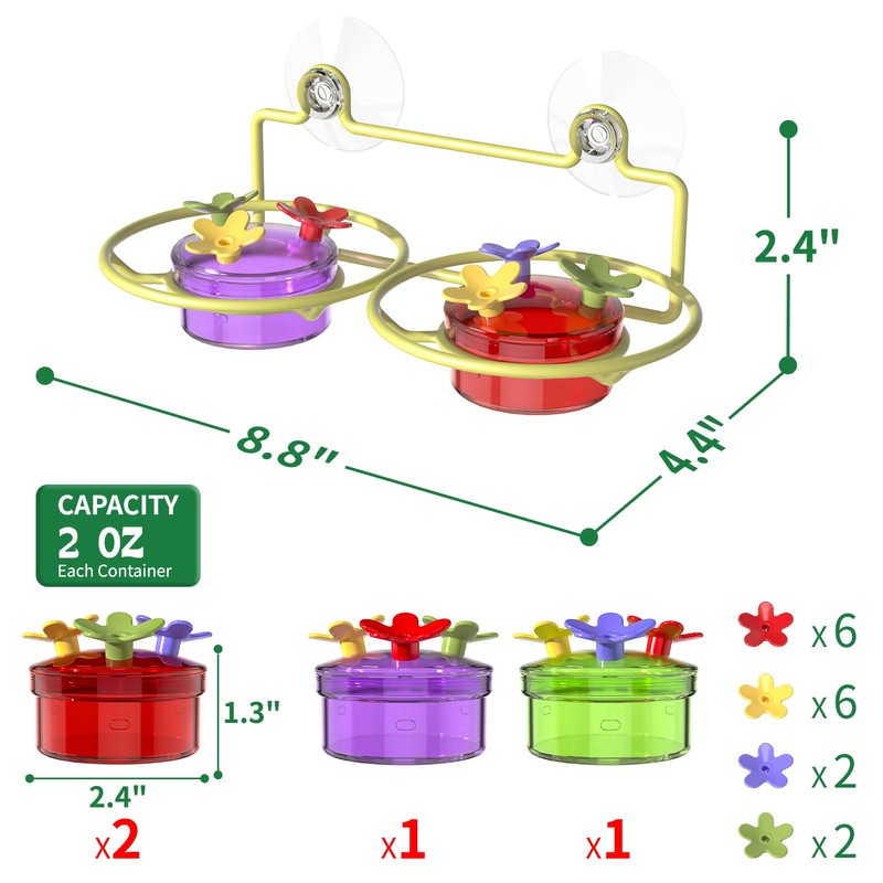 - Small Window Hummingbird Feeder: Our feeder features metal base that attaches to your window with strong suction cups. The base holds two containers, each with a capacity of 2 ounces, and each container includes three bee-proof feeding ports. Bright red and yellow flower accents attract hummingbirds to your window for a close-up feeding experience.