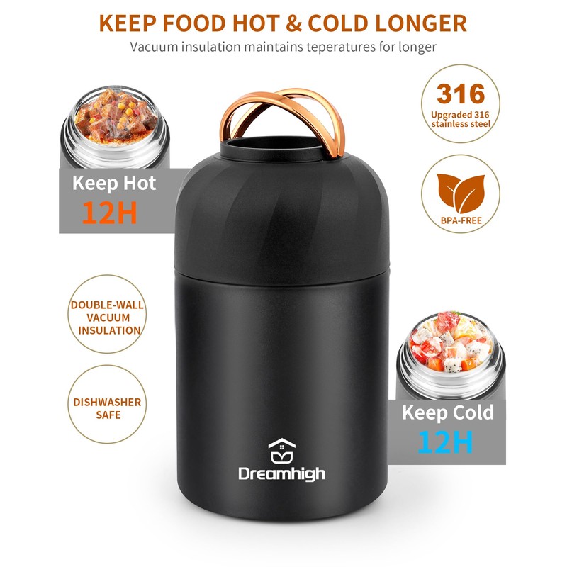 The thermos flask is made of food-safe, BPA-free material and features a 316 stainless steel insulated container and a durable 304 stainless steel exterior. This ensures reliable temperature retention of hot or cold food for 12 hours.