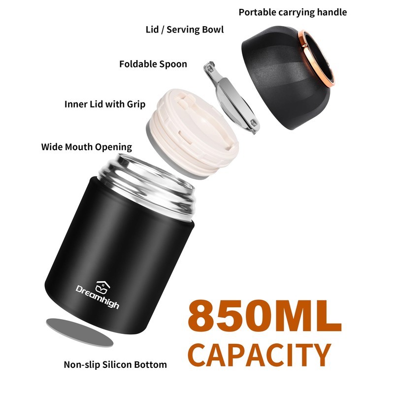 Dreamhigh® Thermal Food Container, 850 ml, Stainless Steel Food Warming Container with Handle, Thermos Food Leak-Proof, Includes Spoon, Hot for 12 Hours, Cold for 12 Hours (Black)