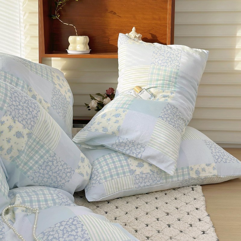 DREAMINGO Double-Layer Guaze Duvet Cover 100% Cotton Floral Checkered Patchwork Blue Bedding Set Girls Cute Comforter Cover with Zipper Closure, Super Soft & Durable, Twin-68x86 Inch