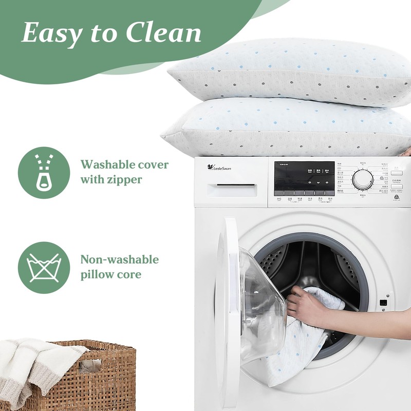 - PILLOW CARE INSTRUCTIONS - Let your pillows air out for 24 hour to fluff up. Place it in a ventilated area if there's a new foam smell(a slight odor is normal with new foam). For easy cleaning, the pillowcase is machine washable; just avoid washing the inner pillow and drying the case to preserve its plushness and cool texture