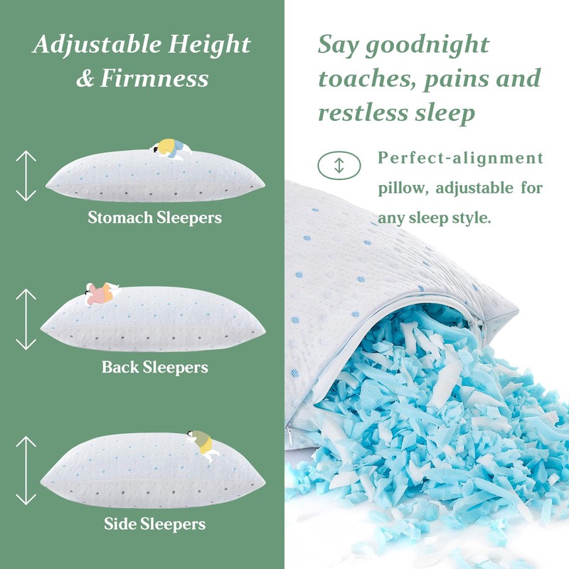 - CUSTOMIZABLE LOFT & FIRMNESS - Tired of pillows that are too hard, too soft, or lack support? Our adjustable bed pillows standard size set of 1 offer hotel-quality softness with firm support. With a zippered design for easy filling adjustment, you can personalize the loft and firmness to fit your sleep style. Ideal for side sleepers, back sleepers, stomach sleepers and college essentials, these cooling pillows for sleeping ensure the ultimate sleep experience