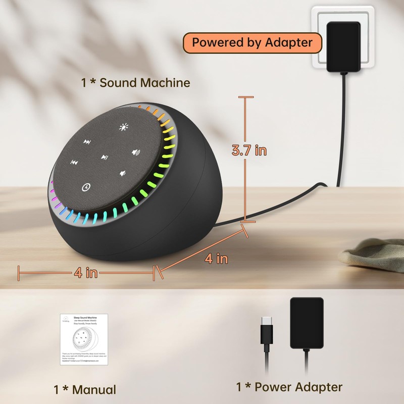 - 26 Soothing SoundsThis sound machine comes with 26 soothing sounds including white noise, brown noise, pink noise, blue noise, fan sounds, ocean wave, rain, birds sound, stream, fire, lullaby, nature sounds and so on which will fit your mood, so that you can drift off into your own dreamy sleep environment every night.