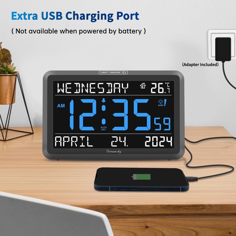 -Digital clock large display with extra usb port to charge your electronic devices.