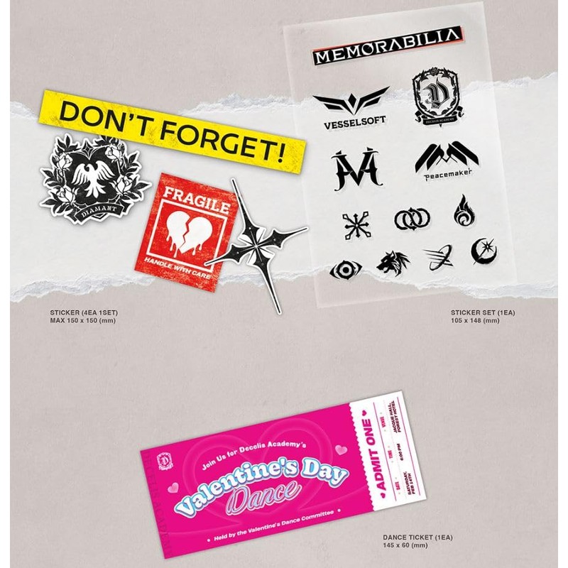 - 💽 Package : Out Box + Keychain + ID Card (7ea) + Match Box + Name Card (7ea) + Coaster + Memo Pad + CD-R + CD Sleeve + Postcard + Character Postcard (3ea) + Lyric Sheet + Character Photocard (7ea) + Photocard (Random 2 out of 14) + Sticker (4ea) + Sticker Set + Dance Ticket