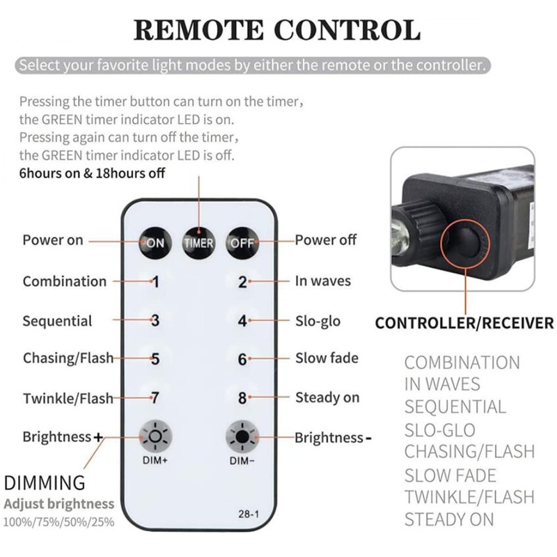 - Newest remote control technology:ON/OFF/TIMER,8 lighting model (1.Combination 2.In Waves 3.Sequential 4.Slo glo 5.Chasing/Flash 6.Slow Fade 7.Twinkle/Flash 8.Steady On),Power adapter easy to use,Just plug in and enjoy.