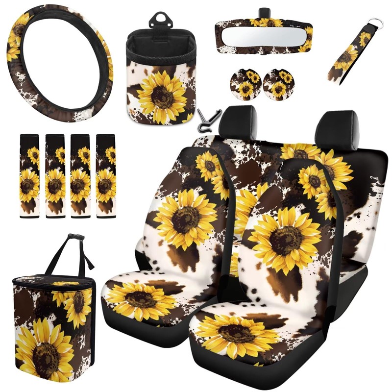 Dreaweet Car Seat Covers Full Set for Women Brown Cow Print and Sunflower Car Accessories - Steering Wheel Cover Seat Belt Pads Car Coasters Trash Bag Air Vent Pouch Rearview Mirror Cover Keychain