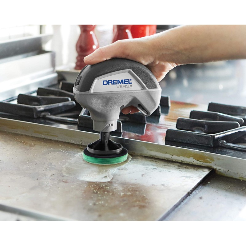 Kitchen dirt and food stains are no match for the Dremel Versa kitchen scour pad. The silica abrasive is great for regular kitchen cleaning tasks (with exclusion of aluminum, stainless steel, copper, coated nonstick cookware, not tempered glass). The Multi-Purpose surface can be used in wet or dry applications to clean cookware, oven racks, stove burners and grates, and much more. Not for aquarium uses.