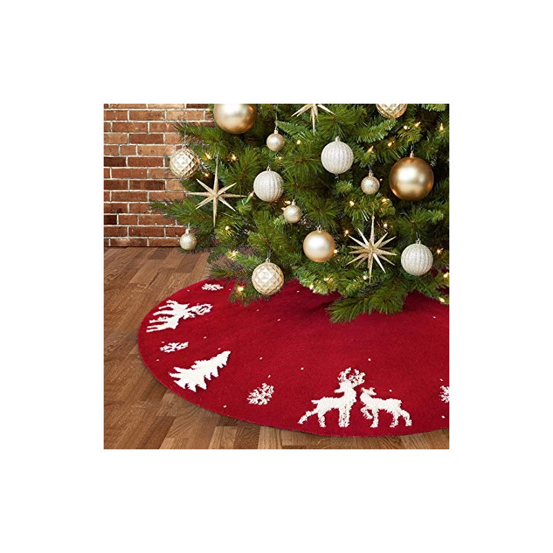 Dremisland Christmas Tree Skirt, 48 inches Red Cable Knit Knitted Thick Rustic Tree Skirt for Xmas Holiday Decoration- 3D Elk and Christmas Tree