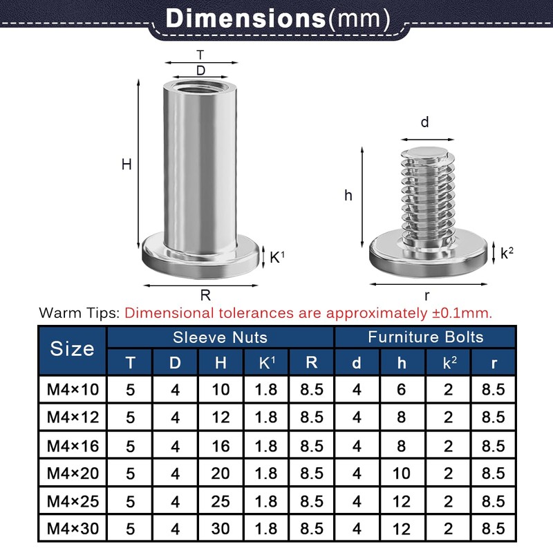 - Package includes: 10 x sleeve nuts M4 x 30mm + 10 x furniture bolts M4 x 12mm. Hexagon furniture bolts can be used to mount beds, doors, tables, chairs, worktops, cabinets, wardrobes and other furniture. We offer a wide range of socket nuts and socket screws to meet different fastening needs.